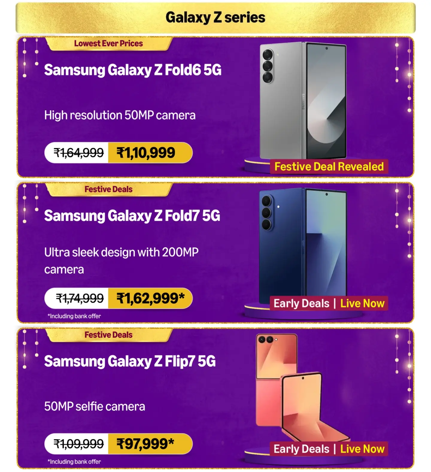 On Amazon, foldable lovers can grab the Galaxy Z Fold 7 for ₹1,62,999 (down from ₹1,74,999) and the Galaxy Z Flip 7 for ₹97,999 (down from ₹1,09,999).
